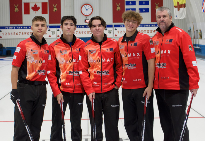 Oliver Lin (lead), Mason Knup (second), Rowan Joyner (Skip) and Luke Stibon (third), with Coach Yvon Lavallée.